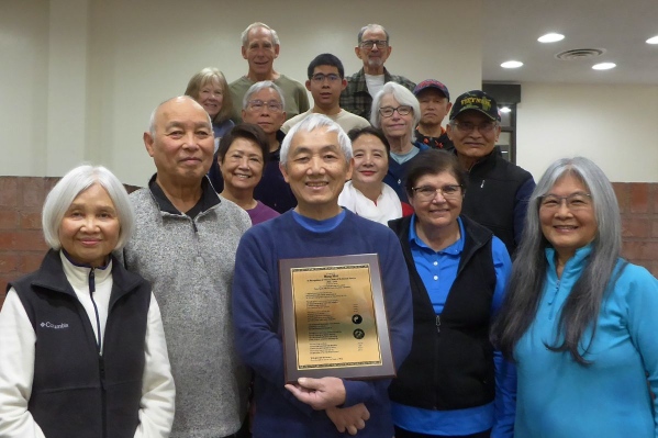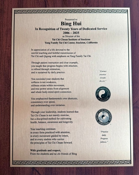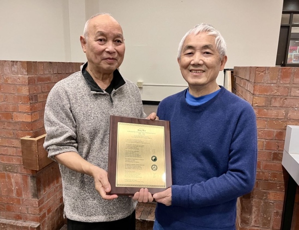 On Saturday, January 17, the YFTC Center Stockton honored Bing Hui for his 20 years of dedicated service as Center Director. Dr. Ray Tom (Center Director Emeritus) presented Bing with a commemorative plaque in appreciation of his commitment to sharing the health, balance, and wellness benefits of tai chi with the Stockton community.