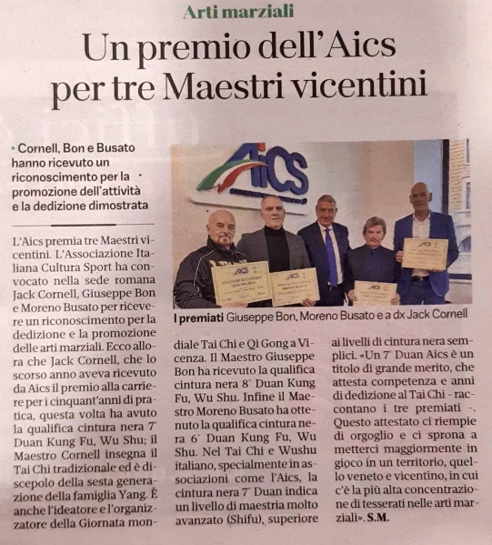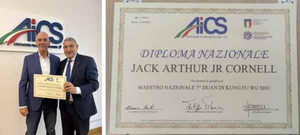 Jack Cornell was surprised and honored to receive from the Honorable Bruno Molea, the 7th degree Black Belt in Kung Fu - Wu Shu for years of dedicating himself to learning and teaching Chinese martial arts and national/international competitions. The award was given to Jack in Rome, Italy at the National AICS/CONI Headquarters in December 2025. Jack is the director of YFTC Center Vicenza, Italy. Congratulations to you, Jack!