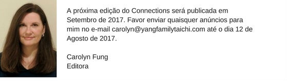 Este evento realizou-se em Danbury, CT, e agora estamos preparando outro TTM nos dias 6 a 8 de Outubro de 2017, que também será em Danbury. O foco será na Forma de 10 Movimentos, pedagogia e Tui Shou. Para mais detalhes, entre em contato com Mari Lewis no e-mail: mari@yangfamilytaichi.com