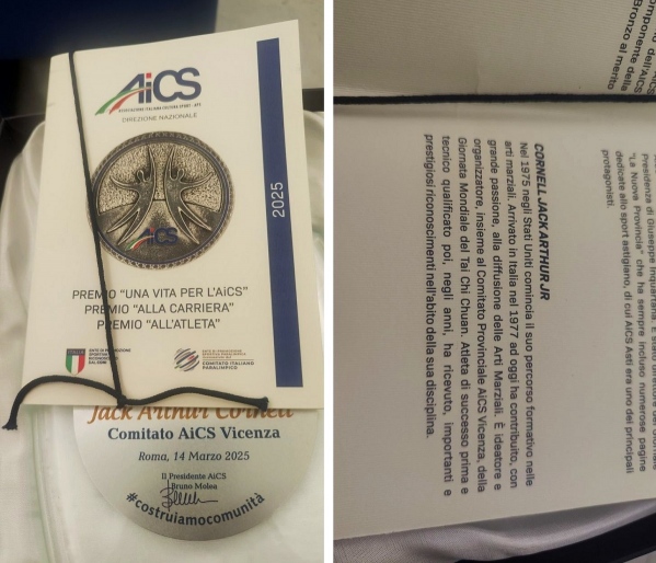 Congratulazioni a Jack Arthur Jr Cornell, Direttore della Scuola YFTC Vicenza (Italia), per aver ricevuto il "Premio alla Carriera" dall'Associazione Italiana Cultura e Sport. Questo prestigioso premio è riservato a persone che, nel corso della loro attività professionale, hanno contribuito alla conoscenza, allo sviluppo e all'affermazione di una cultura sportiva etica.
