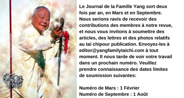 Notre prochain numéro en Décembre 2021. Merci de m’adresser vos contributions à carolyn@yangfamilytaichi.com avant le 19 Novembre 2021.